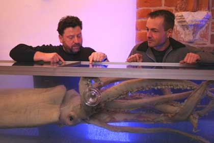 (c) Arne Nies: Uwe Beese und Volkhardt Heller erklären Ihre Arbeit zur Präparation des Riesenkalmar im Dt. Meeresmuseum Stralsund.